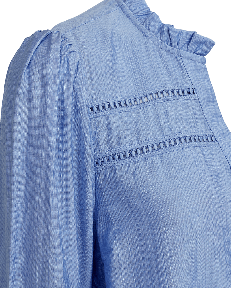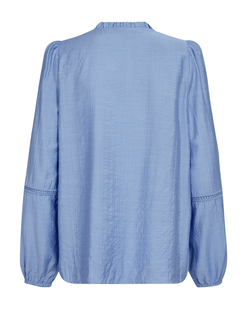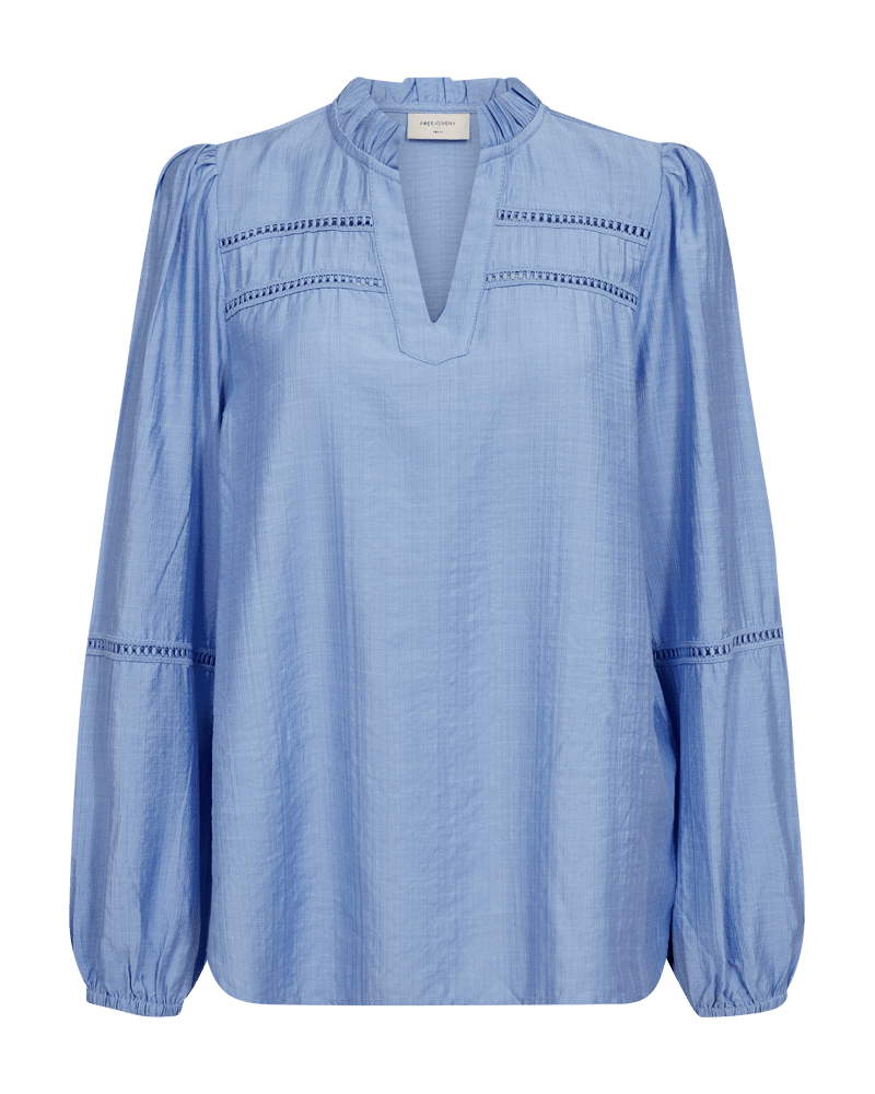 Fin v-ringad blus med dekorativt hålmönster. Liten volangkant på kragen och resår i ärmslut.