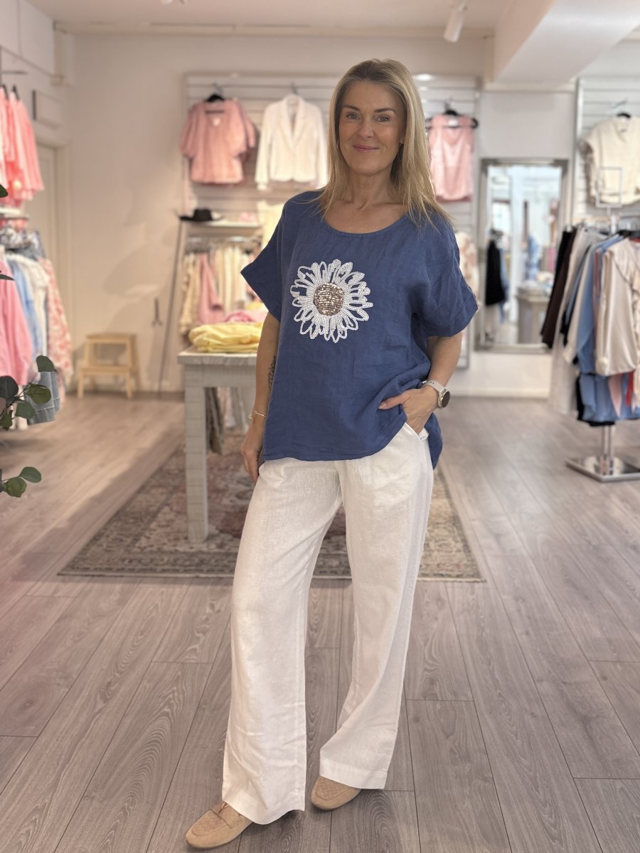 En superfin topp i 100% Lin med en dekorativ blomma.