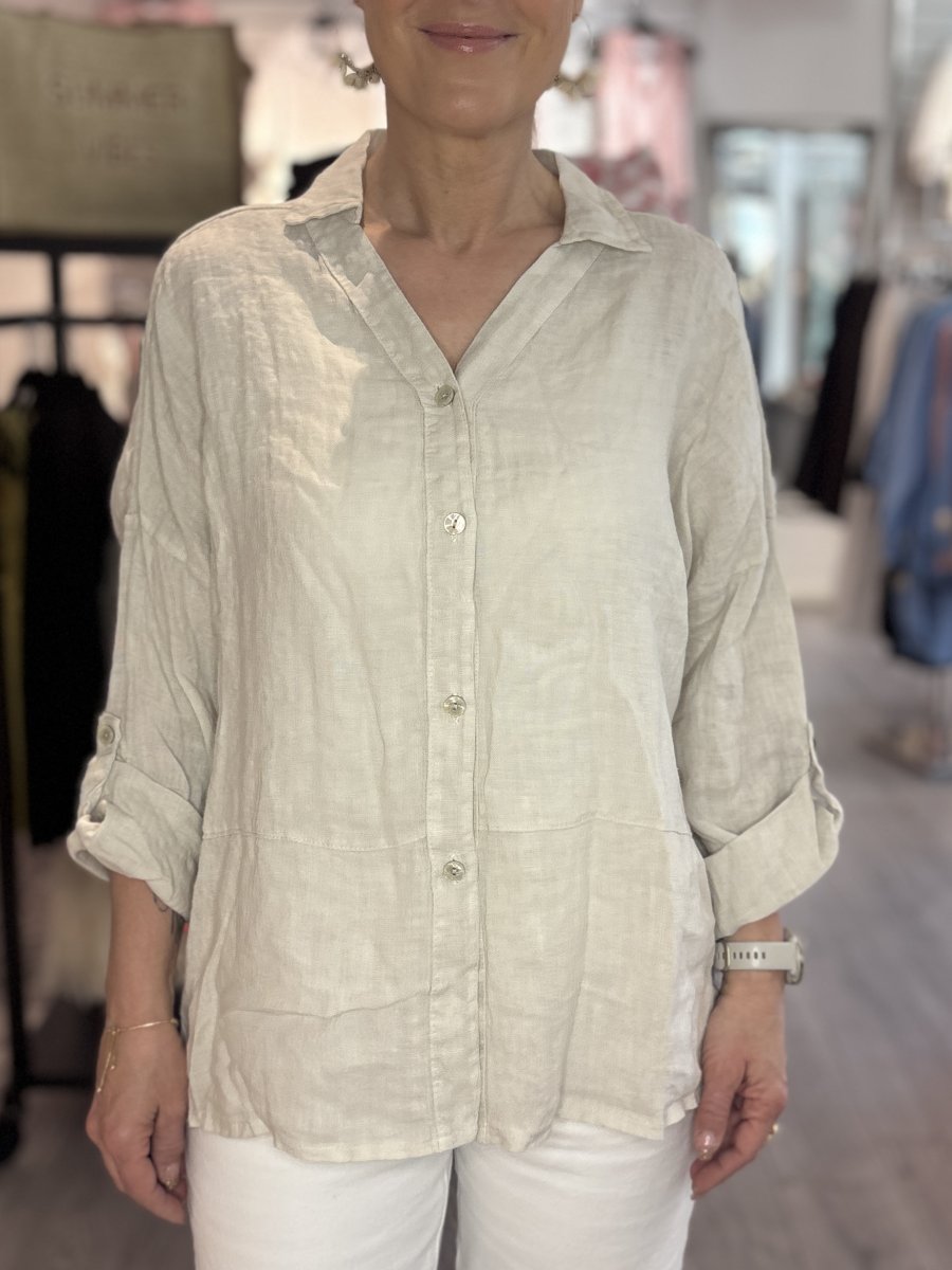 En skön blus i 100% Lin. Blusen har knappar fram, v-ringning med krage och uppvikt ärm med knappslå. Den är lika snygg att använda knäppt som öppen med ett par shorts och ett linne undertill. Använd till ett par jeans eller till ett par linnebyxor alla svala sommardagar.