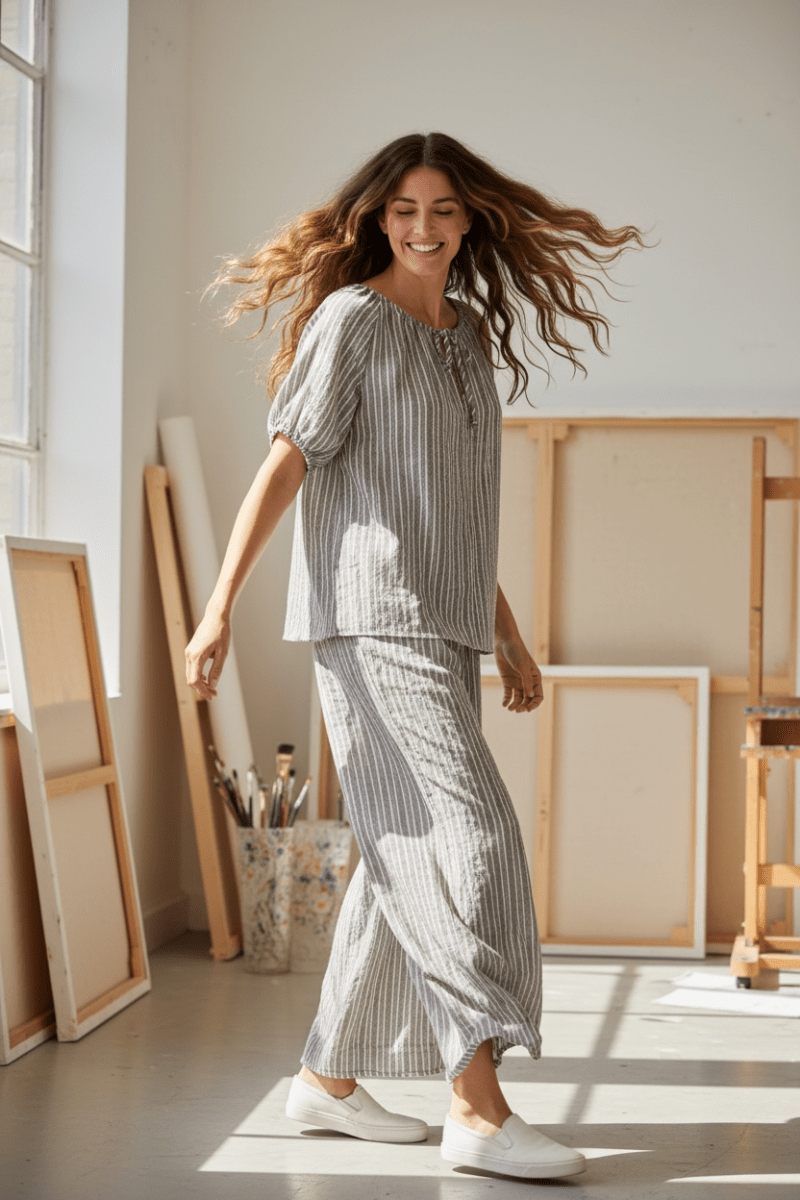 Ett stilrent och bekvämt set i ett tidlöst randigt mönster. Setet består av en luftig topp och matchande byxor i en mjuk blåvit färgkombination.
