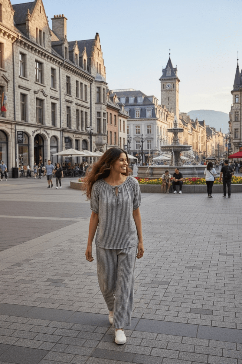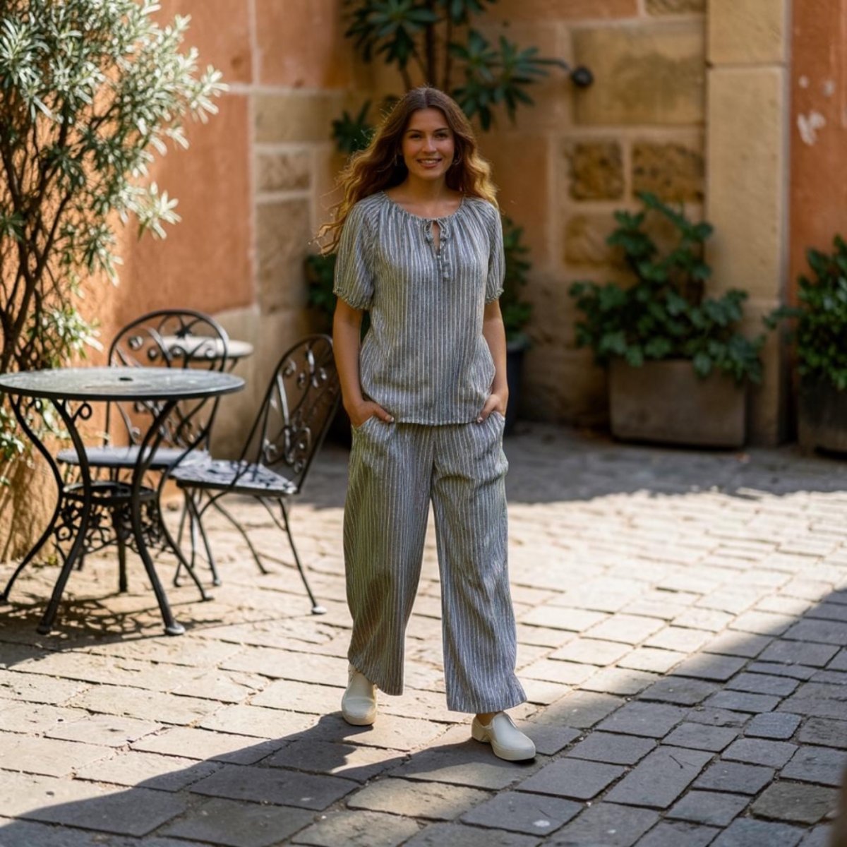 Byxorna har en rak, något vidare modell med resår och dragsko i midjan för optimal komfort och passform. Det lätta materialet gör setet perfekt för både vardag och semester – lika snyggt tillsammans som var för sig.