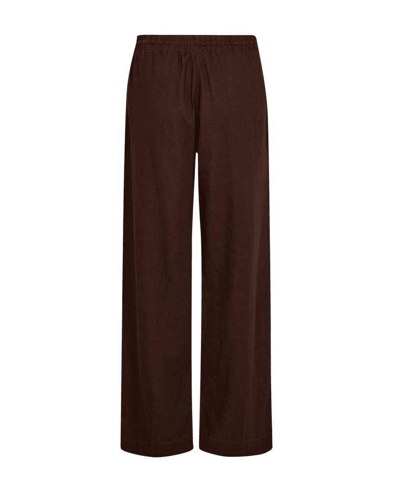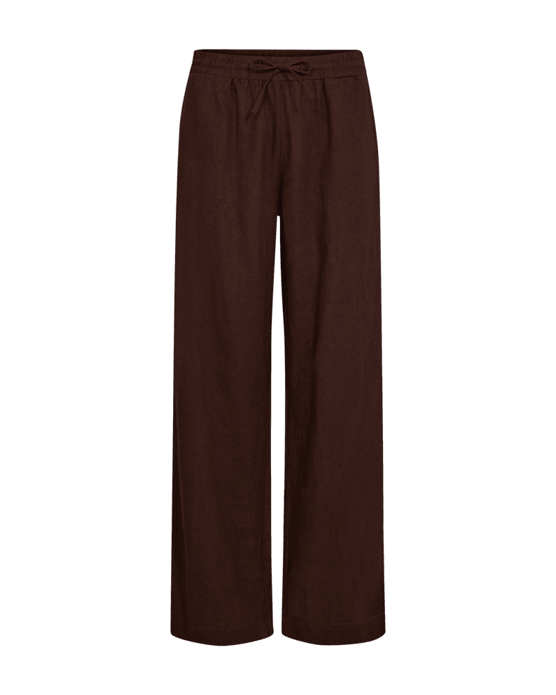 Byxor från Freequent i ett lätt linnematerial. Byxorna har en enkel silhuett med resår i midjan med knytband, hög midja, sidfickor och en elegant, avslappnad passform.
