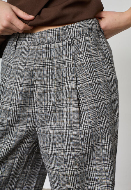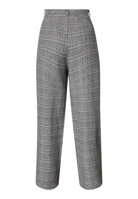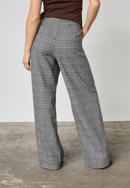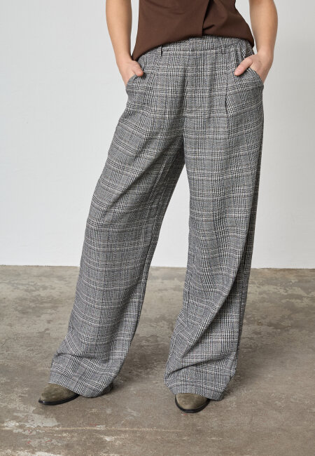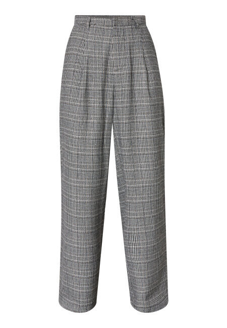 Vida kostymbyxor med hög midja och veck framtill. Byxorna har sidofickor samt knäppning med hyska, knapp och dragkedja. Benen är långa och har en rak nederkant. Färgerna går i creme, svart, grått och kamel.