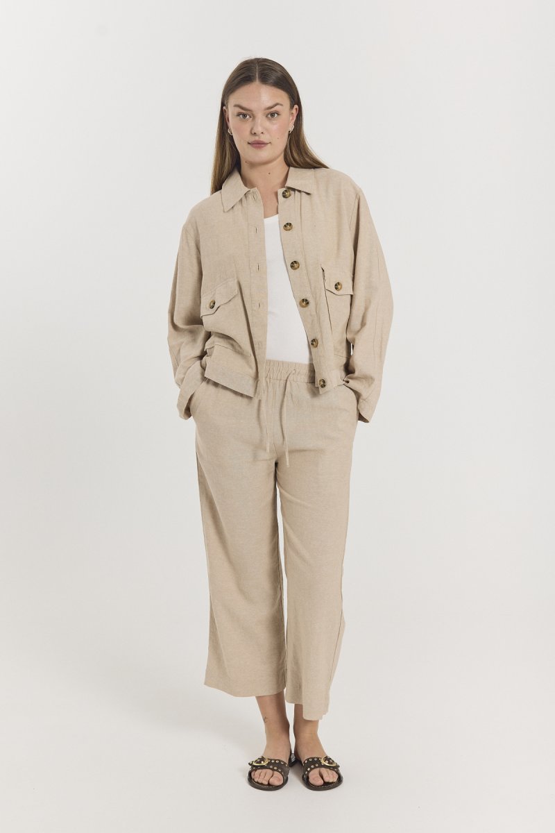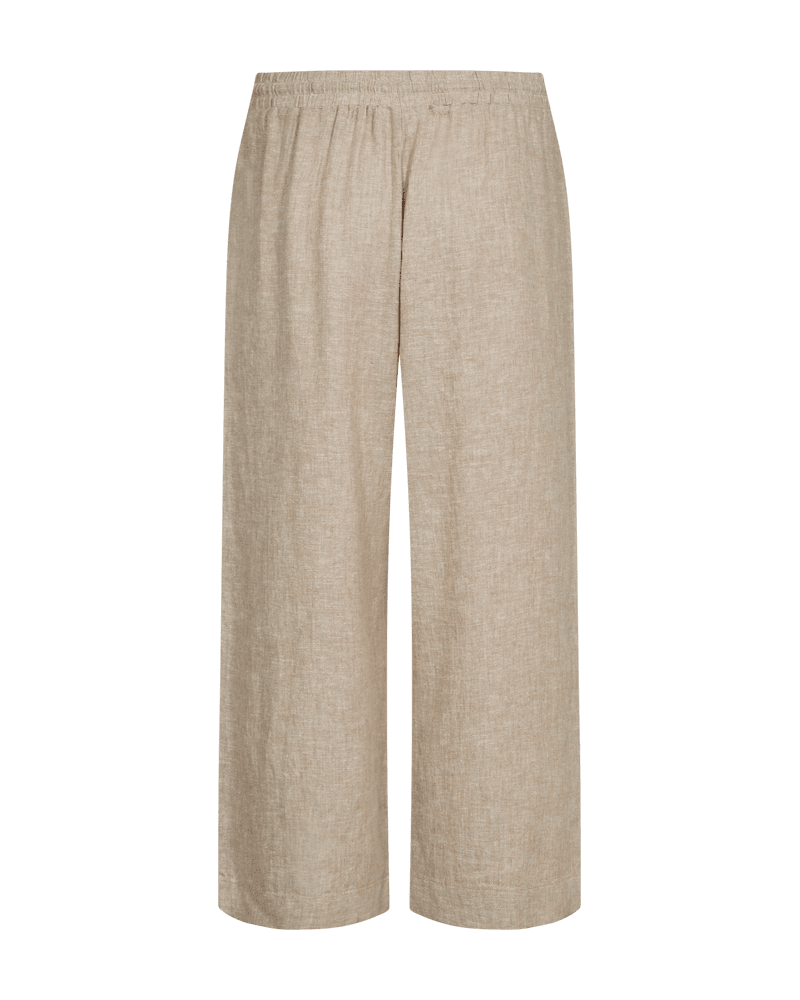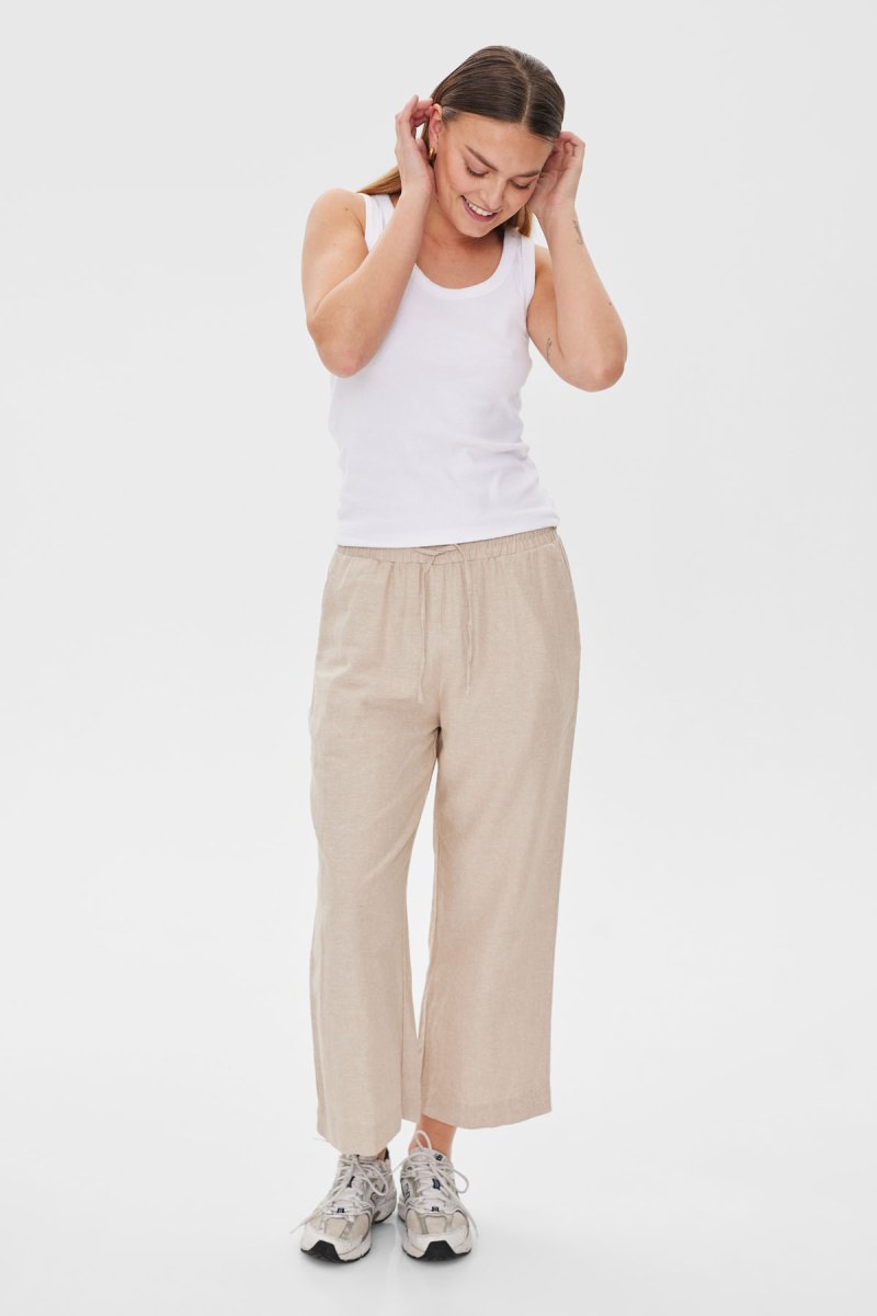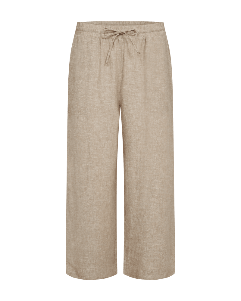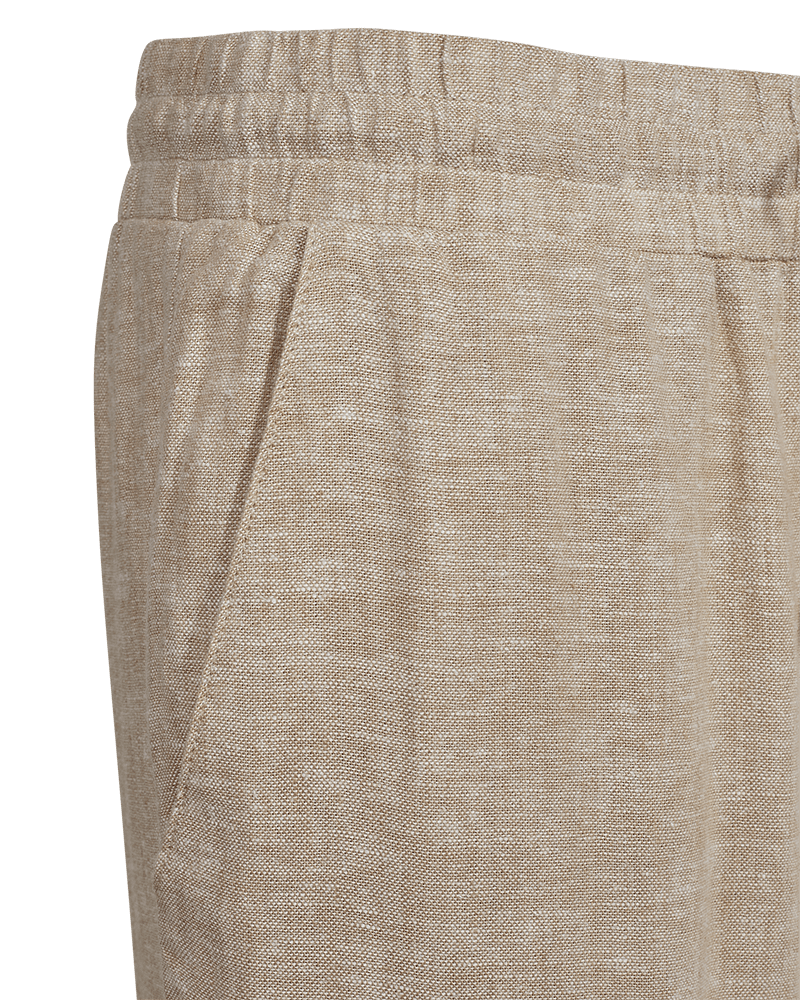 Byxor i 7/8-dels längd från Freequent i ett lätt linnematerial. Byxorna har en enkel silhuett med resår i midjan med knytband, hög midja, sidfickor och en elegant, avslappnad passform.