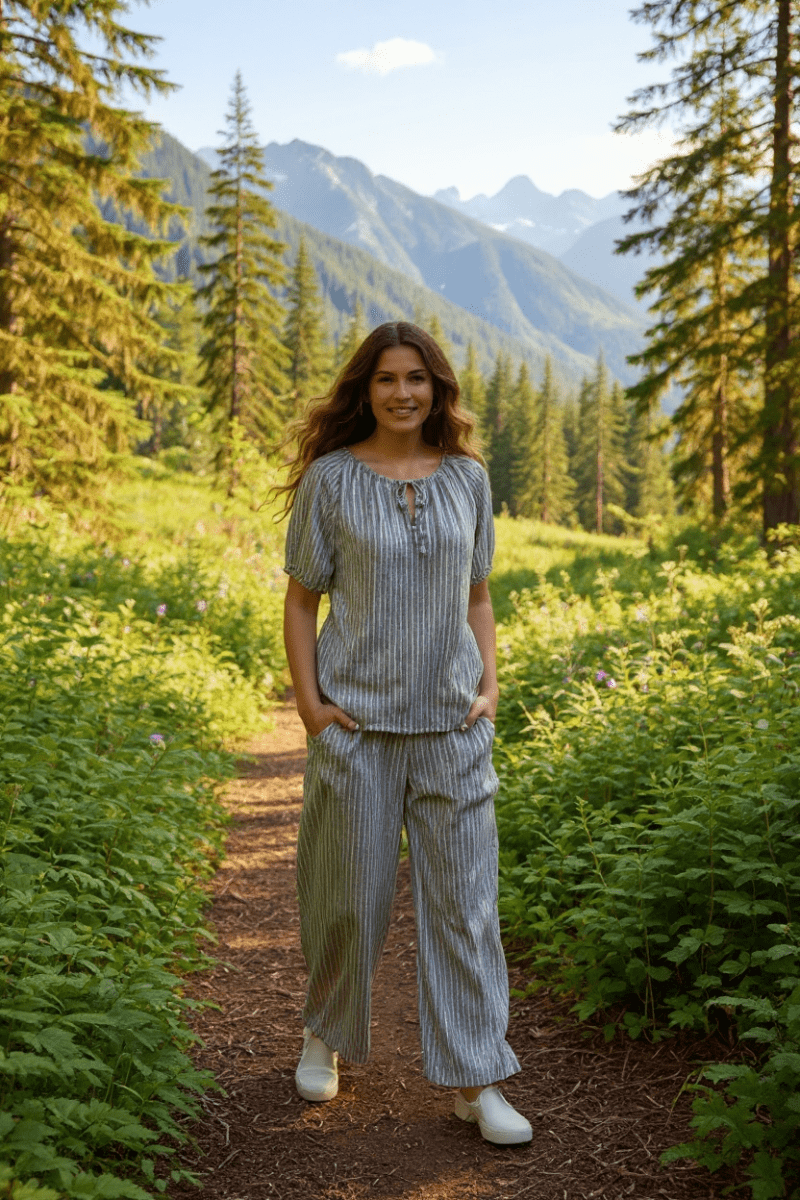 Byxorna har en rak, något vidare modell med resår och dragsko i midjan för optimal komfort och passform. Det lätta materialet gör setet perfekt för både vardag och semester – lika snyggt tillsammans som var för sig.