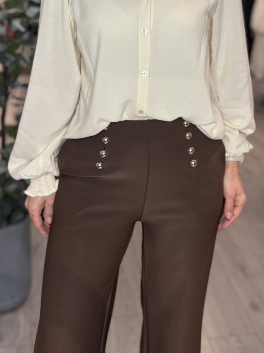 Sienna är en skön byxa med härlig stretch, raka och vida. Byxan har fickor fram, inga fickor bak, resår i midjan och snygga dekorativa knappar fram.