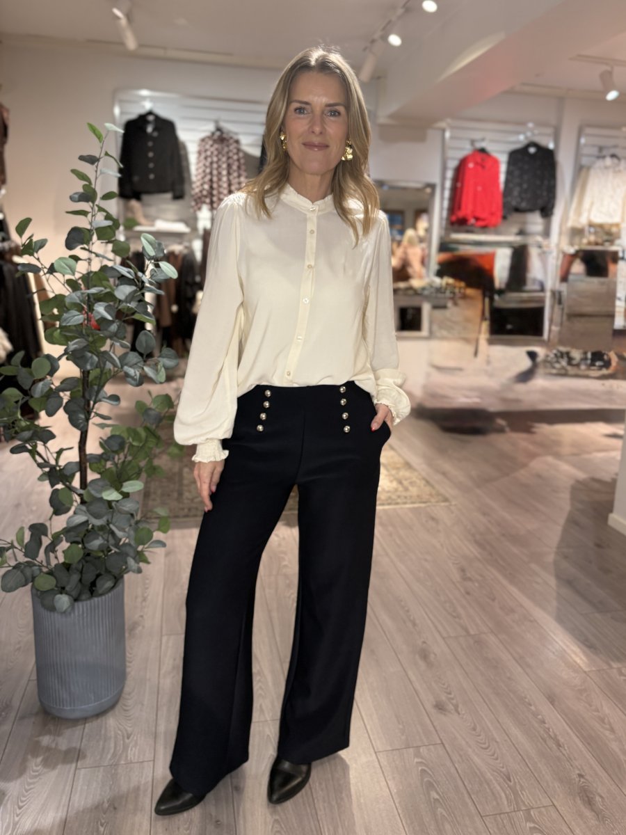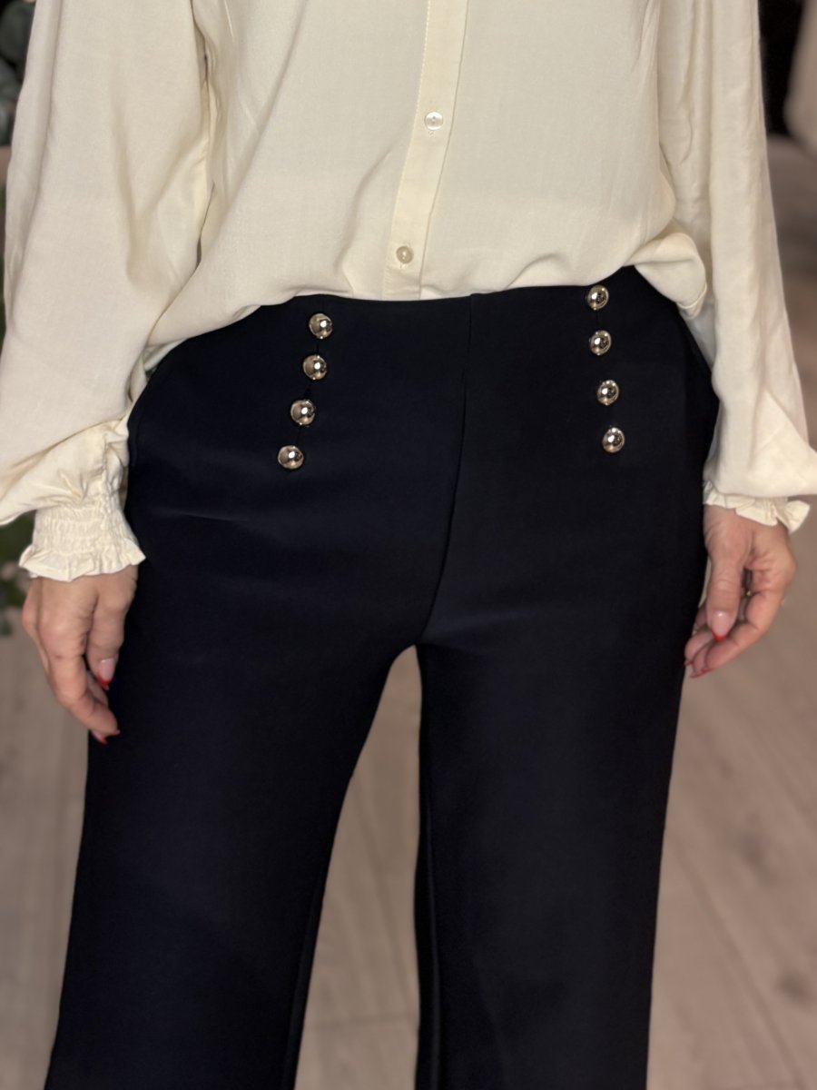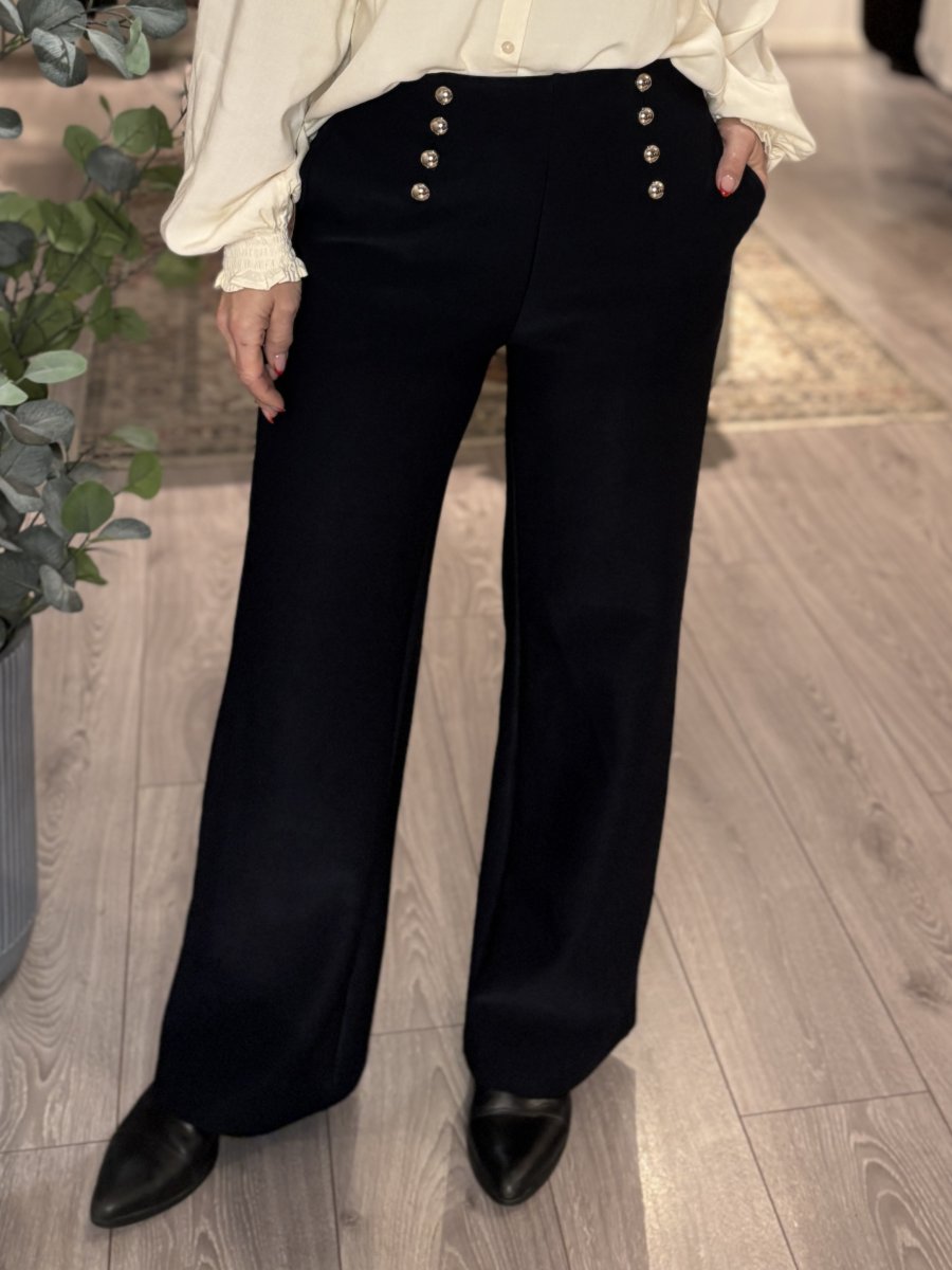 Sienna är en skön byxa med härlig stretch, raka och vida. Byxan har fickor fram, inga fickor bak, resår i midjan och snygga dekorativa knappar fram.