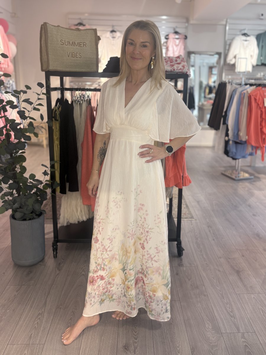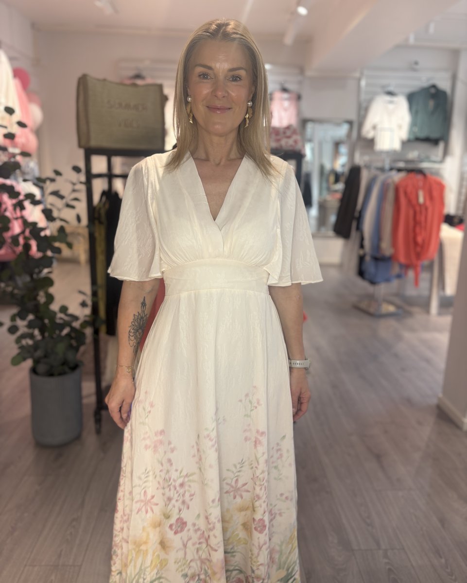 En vacker, romantisk maxiklänning med en mjuk och feminin silhuett. Klänningen har ett insvängt liv med veckad byst och ett elegant V-format omlottliv. Vida, fladdrande ärmar ger en lätt och luftig känsla, perfekt för både fest och vardag. Kjolen faller vackert och har ett subtilt blommönster längst ner som skapar en drömsk, vårinspirerad look.