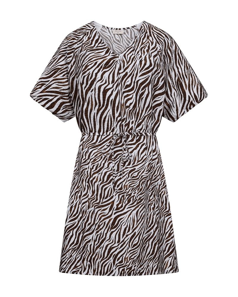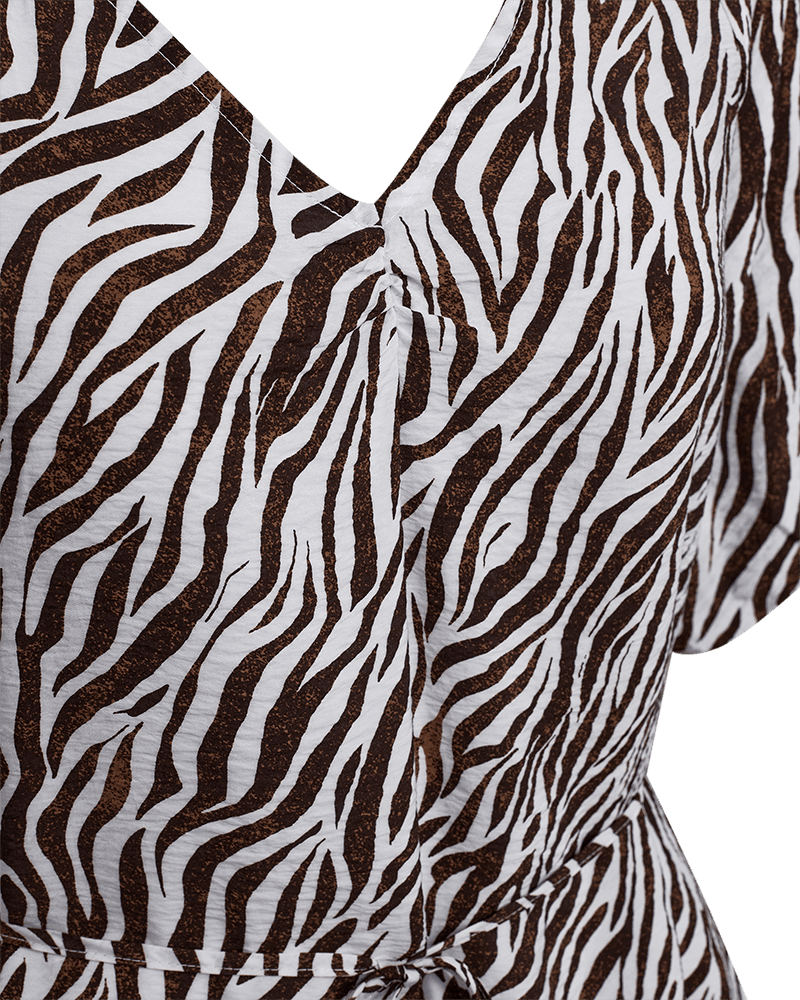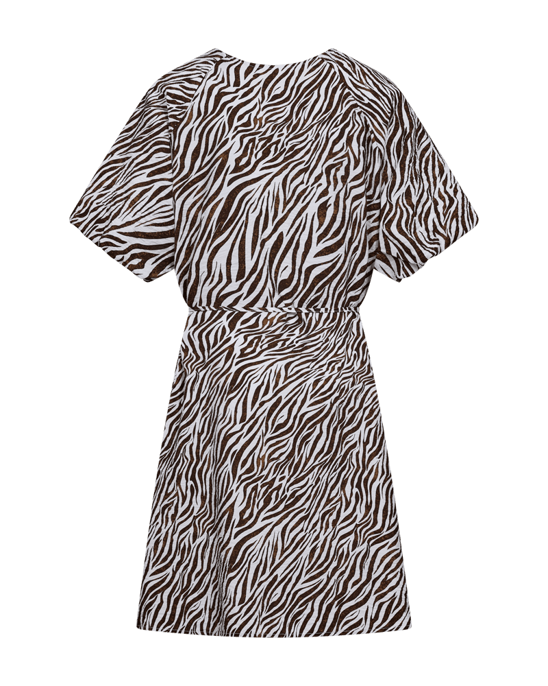 Klänning från Freequent i ett mjukt material med zebratryck. Klänningen har en enkel silhuett med korta ballongärmar, V-ringning med rynkor, knytband i midjan samt en elegant volym i kjolen.