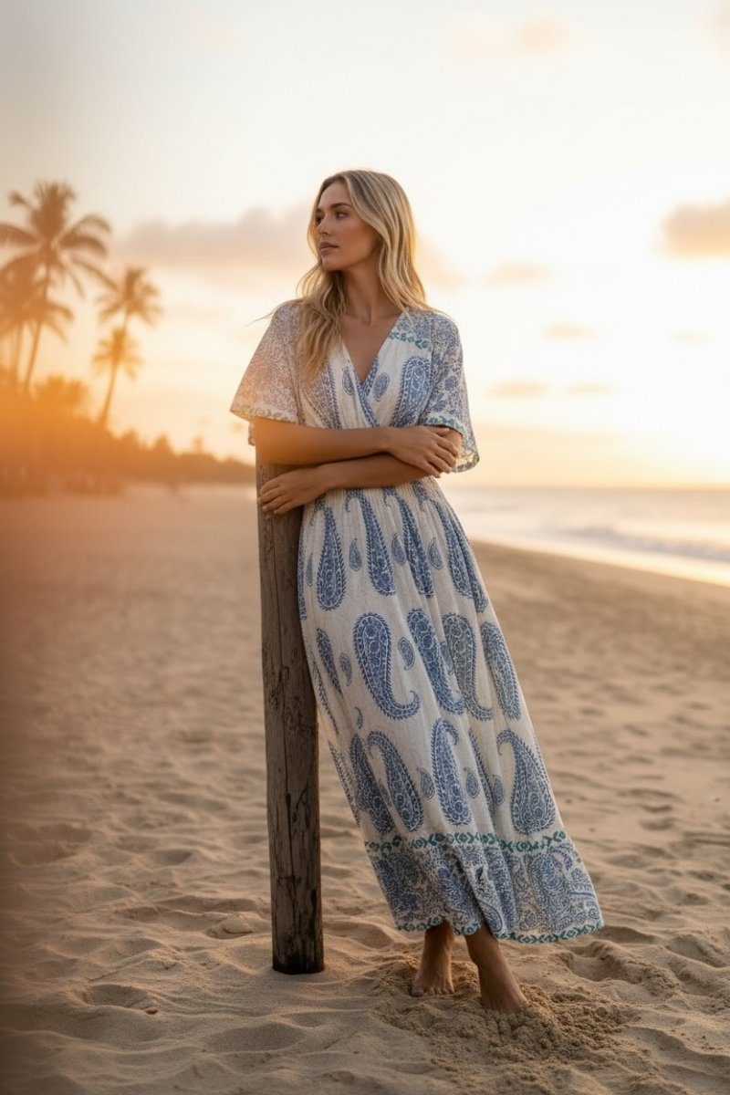 Det luftiga tyget tillsammans med det vackra mönstret skapar en bohemisk look som passar lika bra till vardag som till festligare tillfällen. De mjuka ärmarna och den följsamma kjolen ger ett fint fall och extra rörelse i plagget.