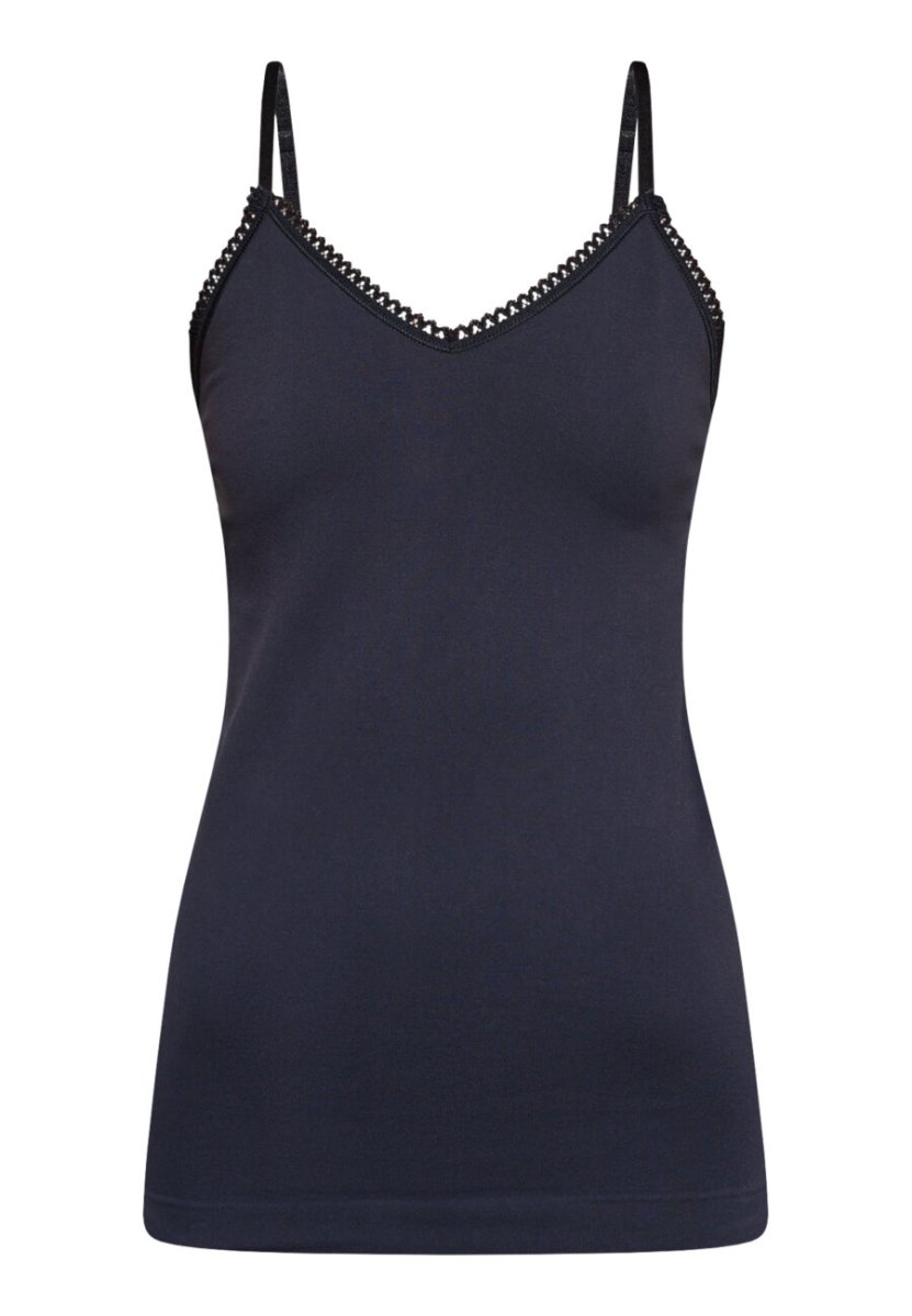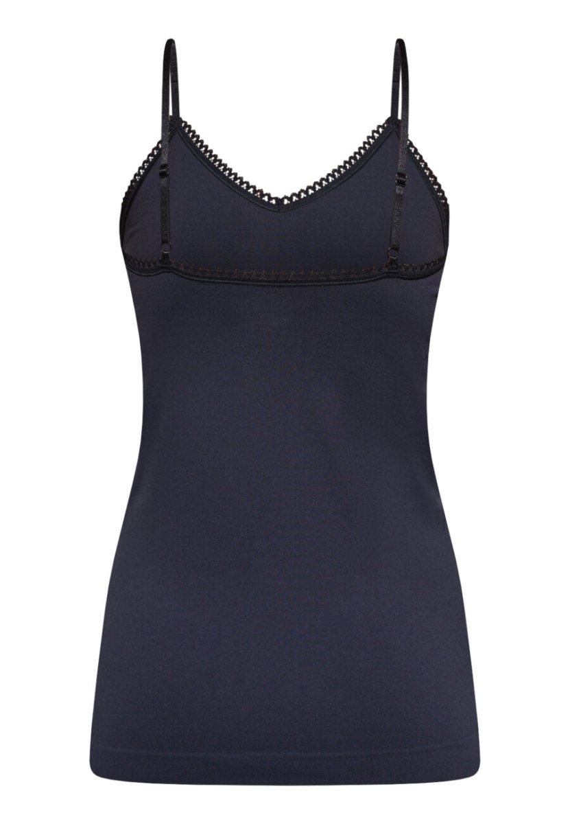 RENT är ett linne i ett stretchigt tyg. Den är designad med en V-ringning framtill, som är kantad med fin, vågig spets. Toppen har tunna, justerbara axelband och en figurnära passform.
