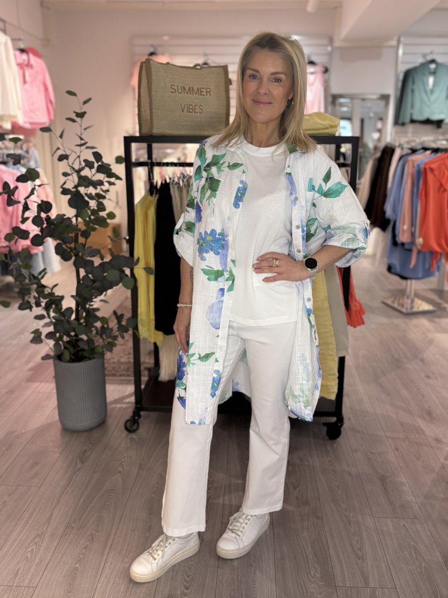 Lång, luftig skjorta i 100% bomull med ett mjukt och somrigt blommönster. Designad med knäppning framtill, klassisk krage och uppvikbara ärmar för en avslappnad känsla. Den svala kvaliteten gör den perfekt för varma dagar – bär den som den är eller matcha med byxor för en stilren och bekväm look