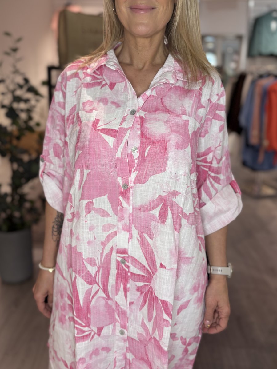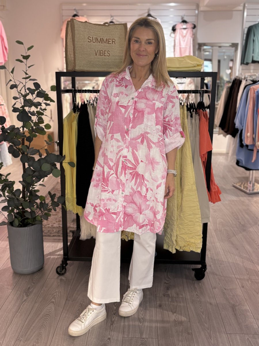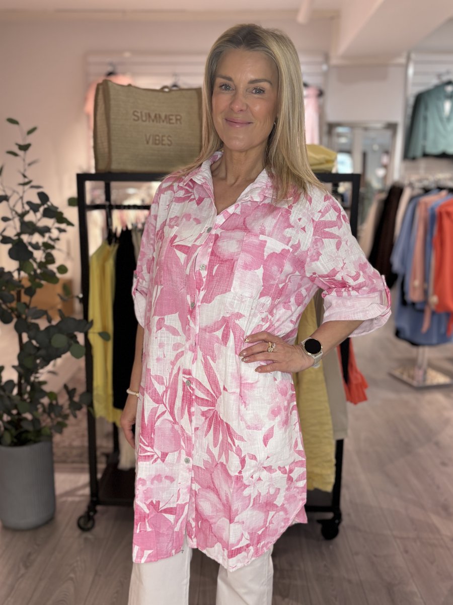Lång, luftig skjorta i 100% bomull med ett mjukt och somrigt blommönster. Designad med knäppning framtill, klassisk krage och uppvikbara ärmar för en avslappnad känsla. Den svala kvaliteten gör den perfekt för varma dagar – bär den som den är eller matcha med byxor för en stilren och bekväm look