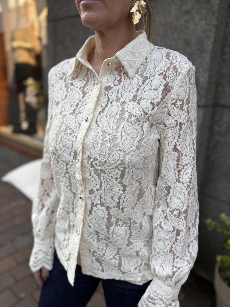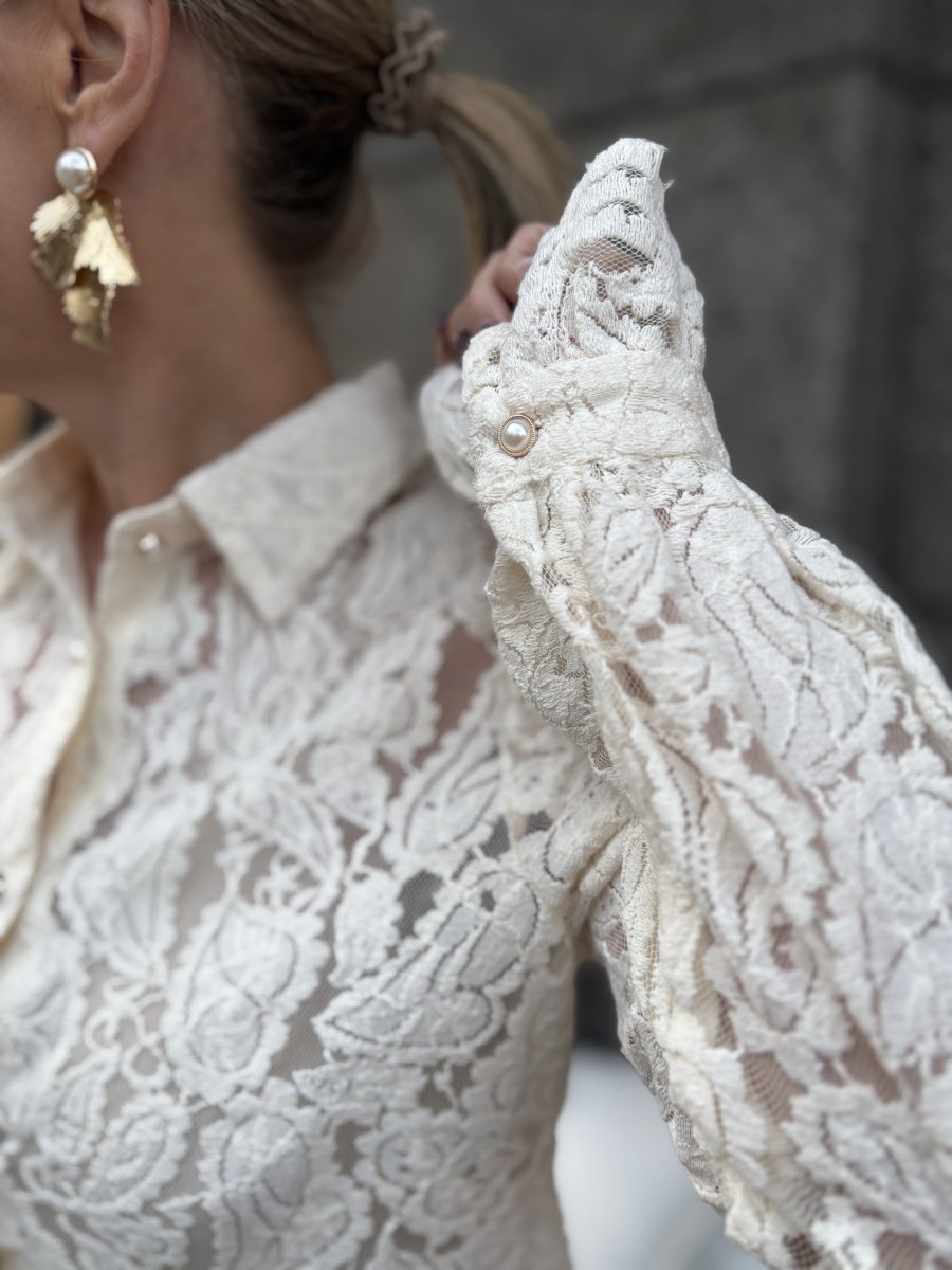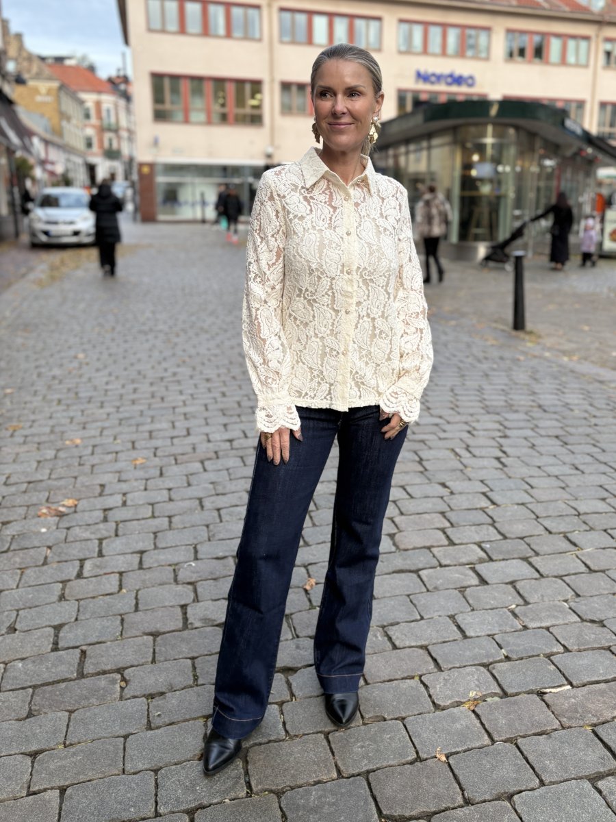 En vacker skjorta i spets med dekorativa knappar och en fin liten volang i ärmslut med knapp. Fin att bära till ett par jeans eller dressa upp till en finbyxa eller kjol.