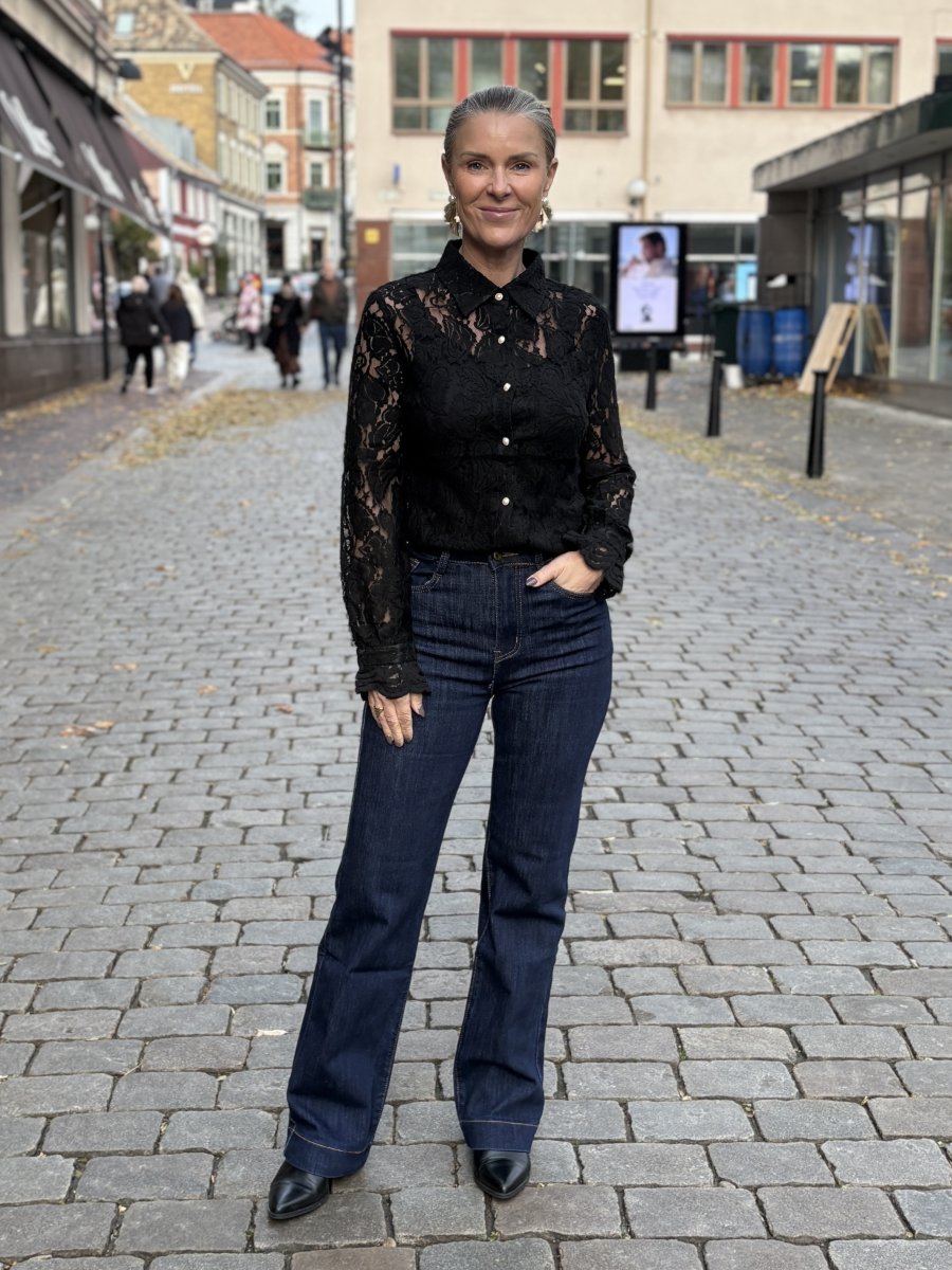 En vacker skjorta i spets med dekorativa knappar och en fin liten volang i ärmslut med knapp. Fin att bära till ett par jeans eller dressa upp till en finbyxa eller kjol.
