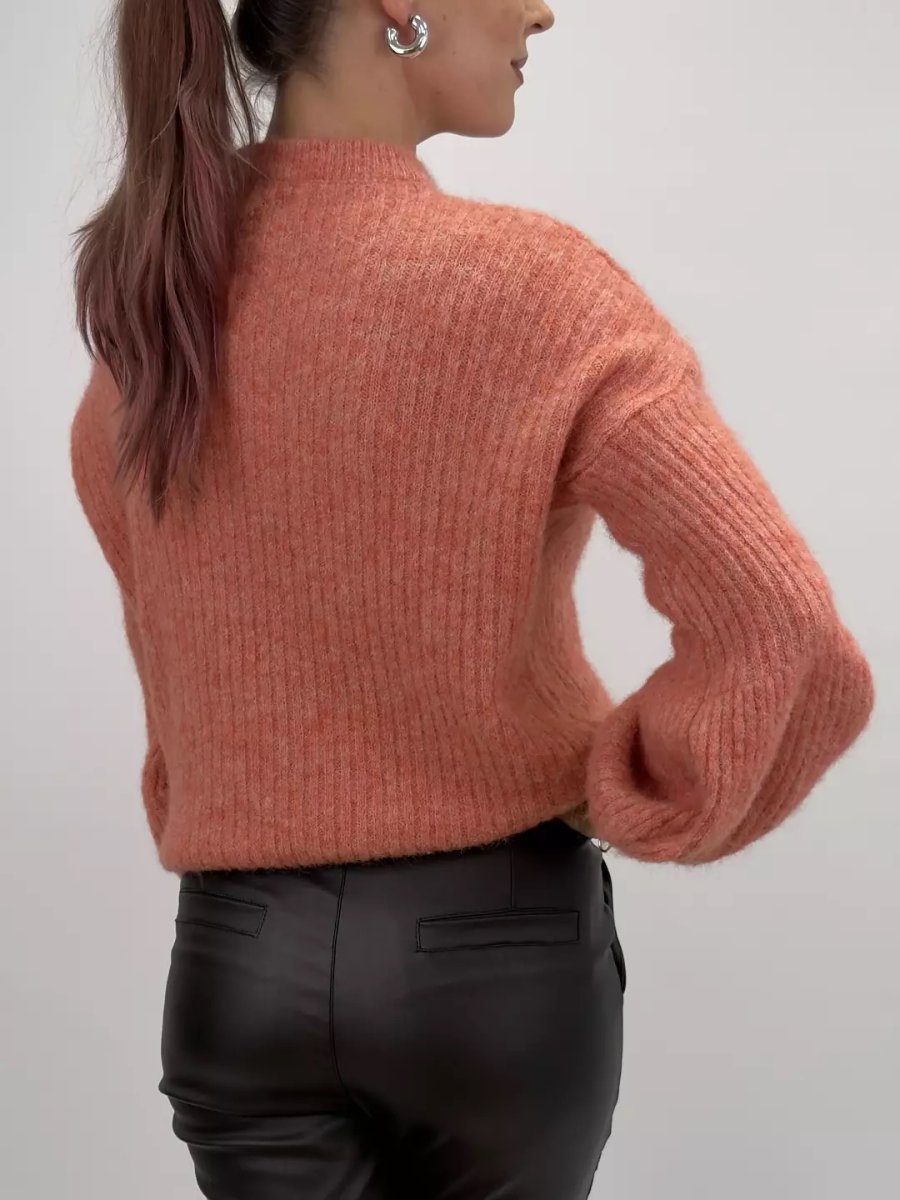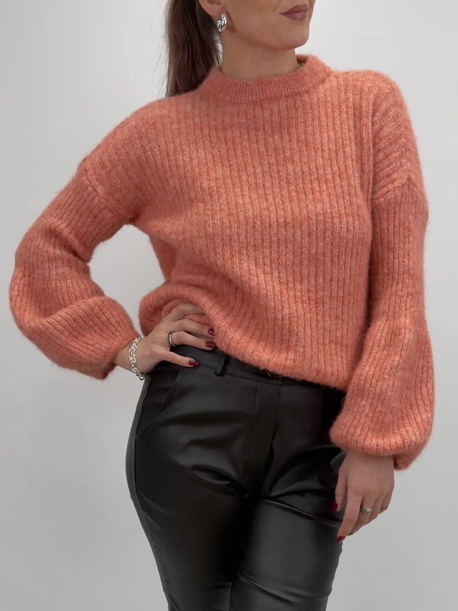Mallan är en stilren stickad tröja med ribbad struktur och lätt ballongformade ärmar som ger ett modernt uttryck. Den klassiska rundhalsen och avslappnade passformen gör den till ett mångsidigt plagg som passar till allt.