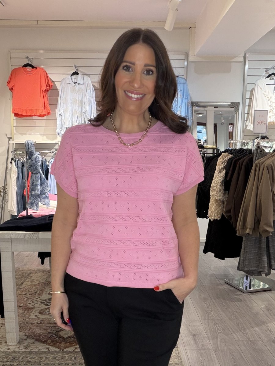 En hålstickad fin topp med rund hals. Rak modell med en liten ribbad kant nedtill, i halsringning och ärmslut.