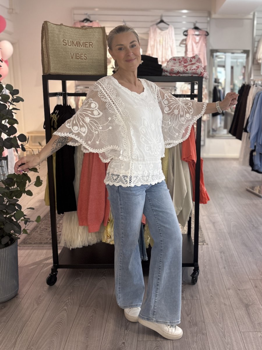 En drömmig blus i mjuk, solgul nyans som fångar känslan av sommar och elegans i ett. Den vackra spetsdesignen ger ett romantiskt och luftigt uttryck, medan de vida, broderade ärmarna skapar en smickrande siluett med det lilla extra. Den markerade midjan ger en feminin passform som framhäver figuren på ett naturligt sätt.