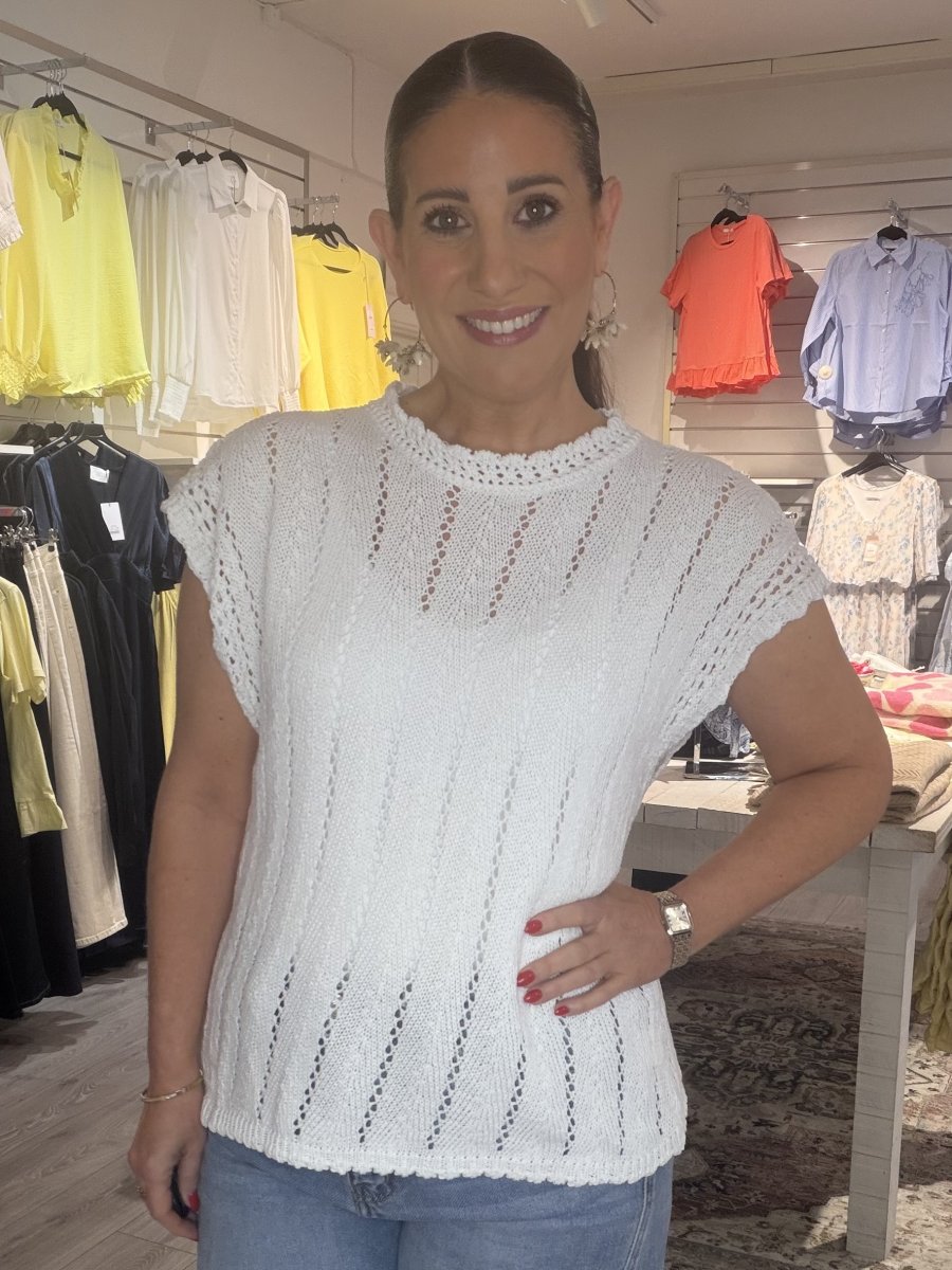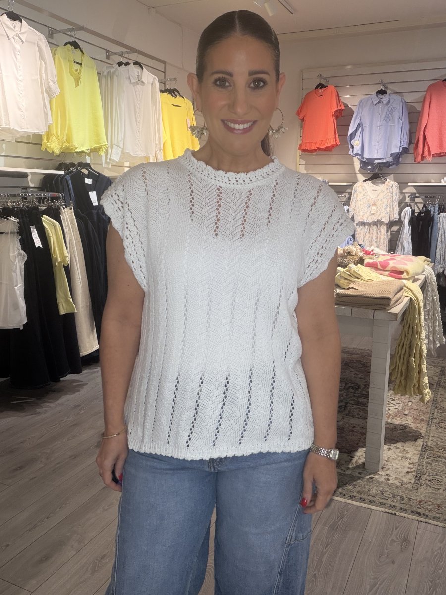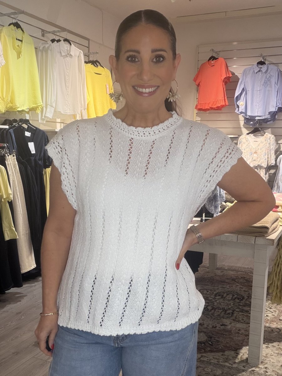 Fin kortärmad tröja, lätt stretch med vackert virkat mönster.