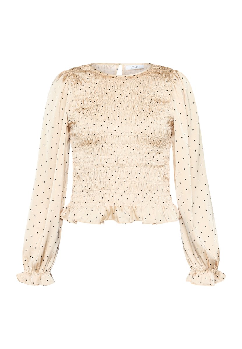 NIX är en prickig blus med långa, rynkade ärmar med resårkanter. Blusen har rund halsringning och smockmönster både fram och bak.