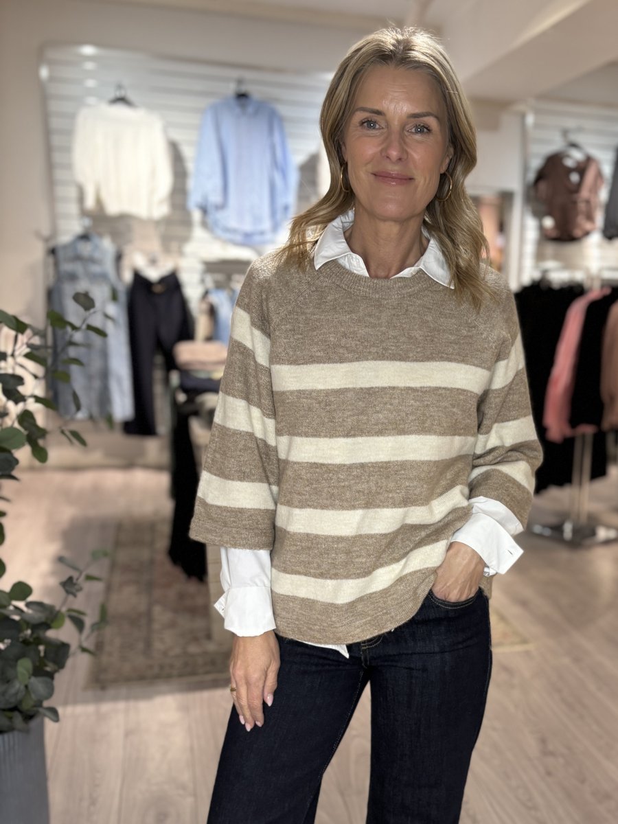 En pullover med klassisk rund halsringning med breda horisontella ränder och trekvartsärmar för en elegant look. Kombinera den med skräddarsydda byxor eller dina favoritjeans för en unik stil.