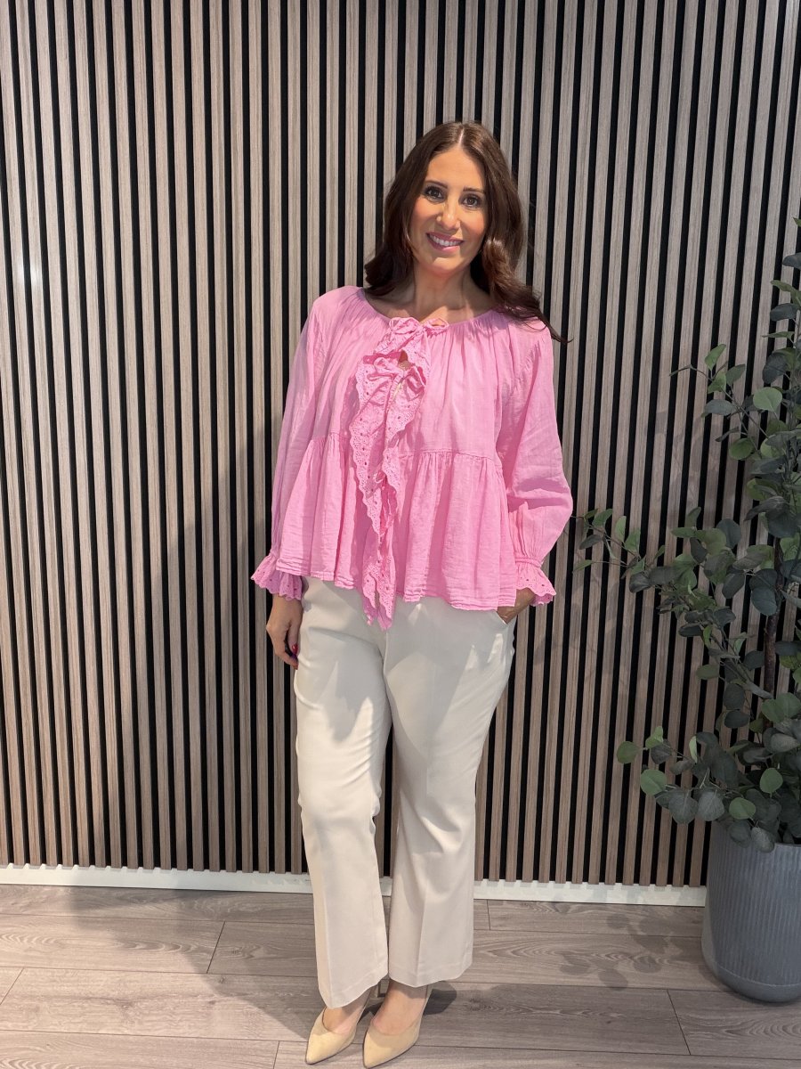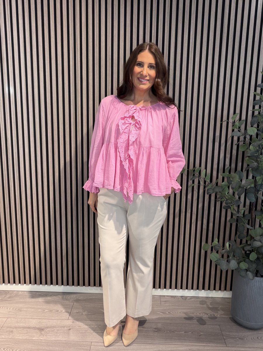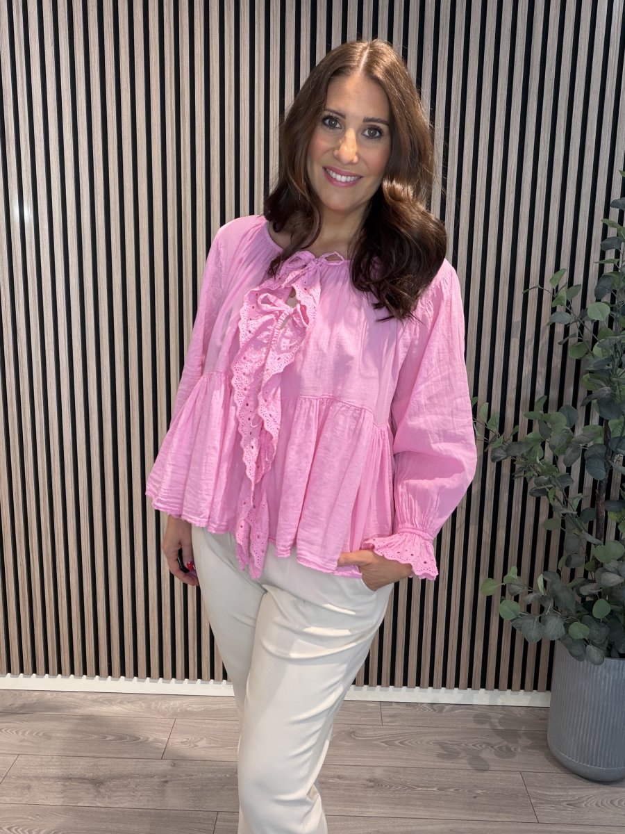 En fin romantisk blus med spetsvolang i skön bomull. Rund hals med resår och knytband fram. Resår och volang i ärmslut.