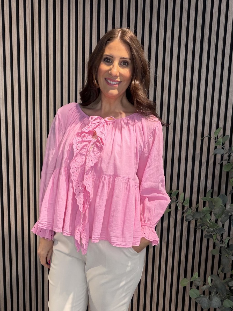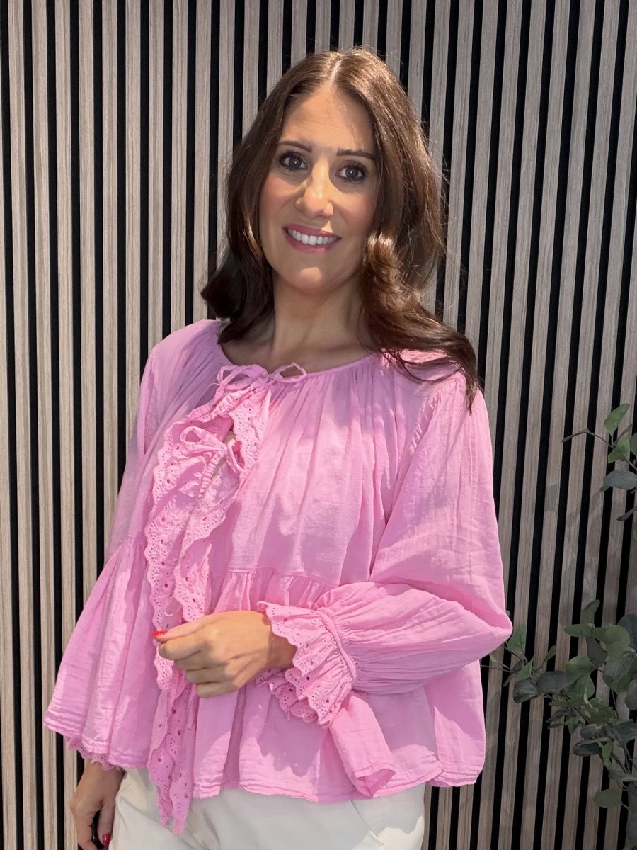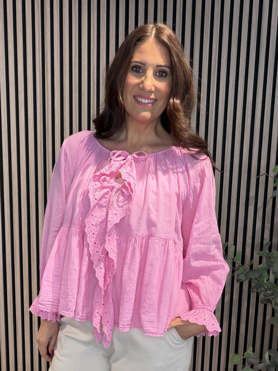 En fin romantisk blus med spetsvolang i skön bomull. Rund hals med resår och knytband fram. Resår och volang i ärmslut.
