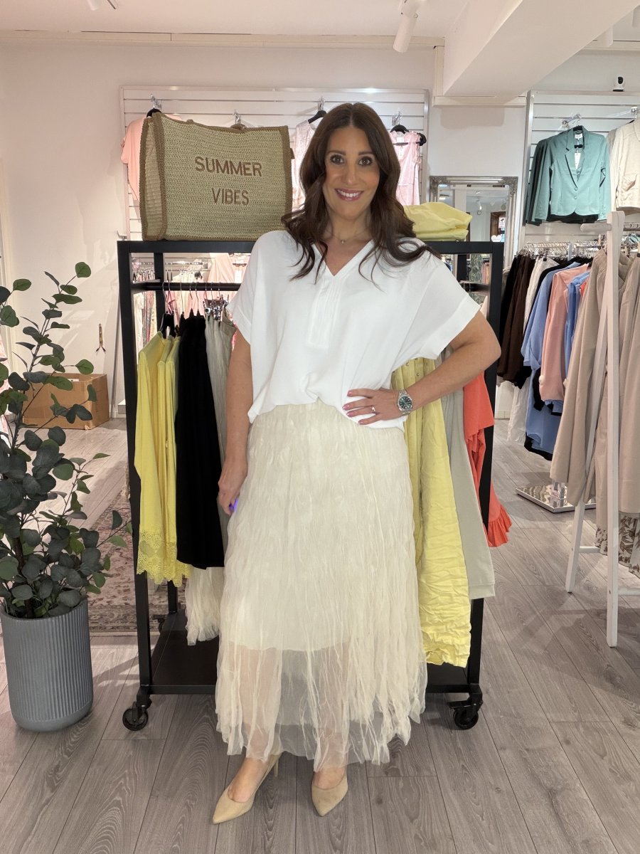 Fin tyllkjol med resår i midjan och innerkjol. Sätt vår fina Nova-topp till eller varför inte en stickad tröja för lite kyligare kvällar!