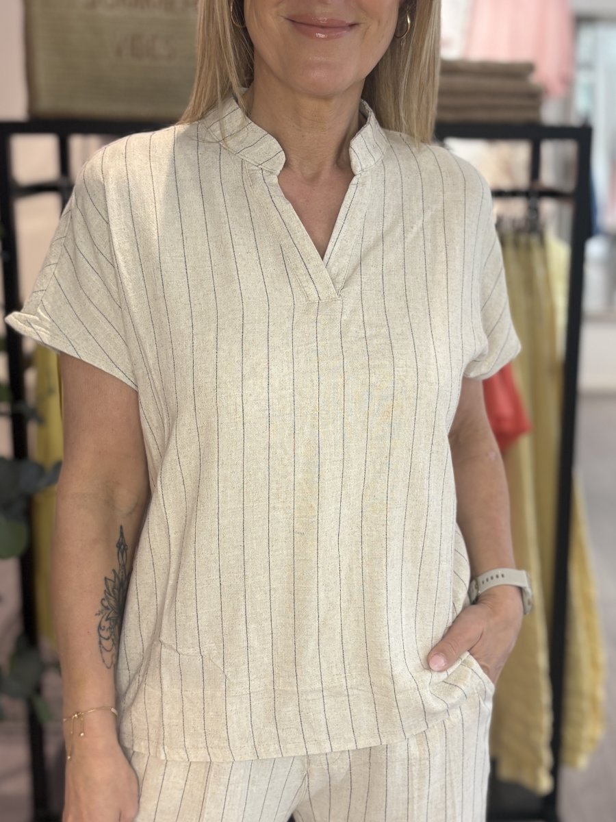 En mjuk och fin topp med randigt mönster i skön linnemix. Toppen har en v-ringning och kort ärm. Snygg att matcha som ett set med vår snygga byxa Karina.