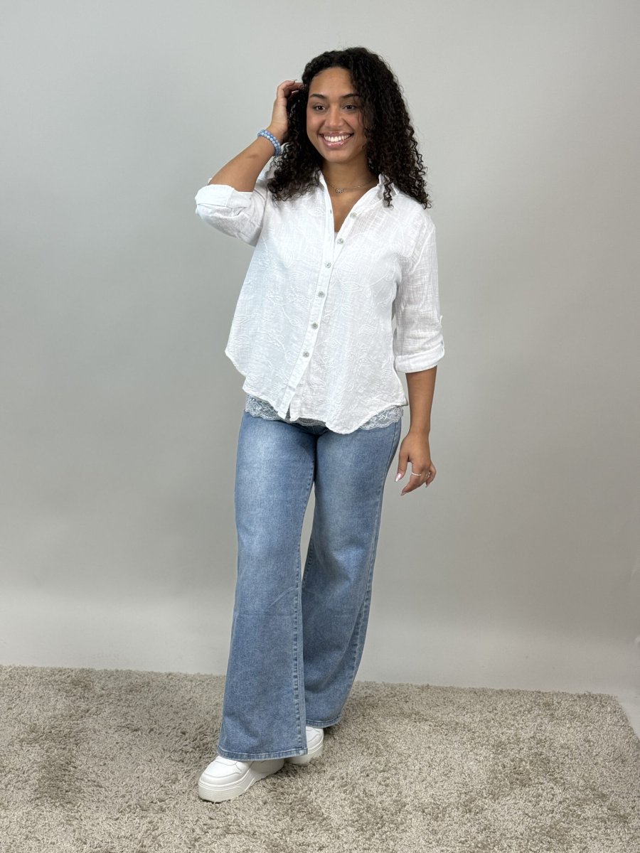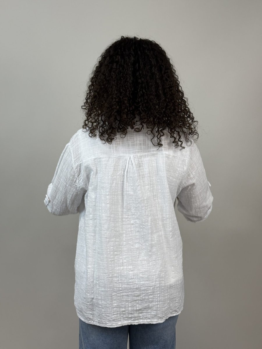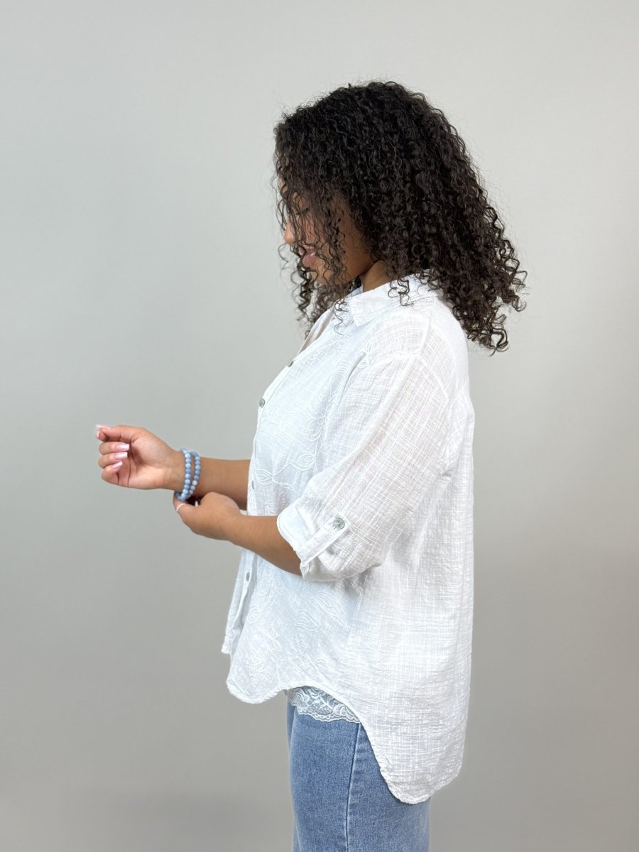 Skön bomullsblus med knappar fram och ett broderat mönster i tyget. Uppvik på ärmen som fästes med en knapp.