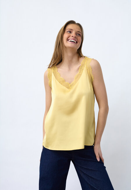 Snyggt linne med spetsdetaljer. Detta linne kan du dressa upp till en snygg byxa eller kjol eller också bara till ett par snygga jeans och ett par sneakers, snygg att använda under en kavaj.